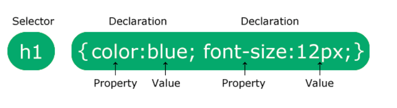 Setiap deklarasi menyertakan nama properti CSS dan nilai, yang dipisahkan dengan titik dua.